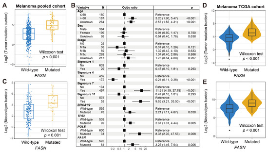 Association between FASN mutations and mutational burden in melanoma. (A) Distinct distribution of TMB in FASN two subgroups in the pooled cohort. (B) Multivariate logistic regression model of FASN mutations was conducted with clinical factors, extracted mutational signatures, and genomic maintenance regulator mutations taken into account. (C) Distinct distribution of NB in FASN two subgroups. Association of FASN mutations with (D) TMB and (E) NB in the TCGA cohort.