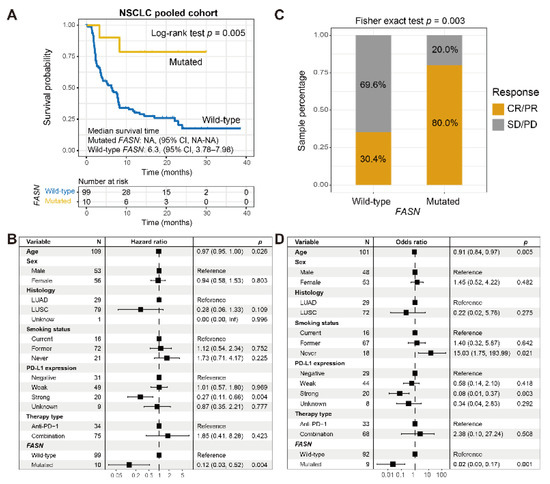 Of the 109 curated NSCLC samples, 36 (33.0%) exhibited the ICI responsive status. Ten (9.2%) of 109 patients harbored FASN mutations. Univariate survival analysis revealed that FASN mutated NSCLC samples exhibited an improved immunotherapeutic survival than other patients (p = 0.005; Figure 4A). A consistent result was obtained in a multivariable adjusted Cox analysis with confounding factors taken into account (p = 0.004; Figure 4B). Associations between FASN mutations and ICI outcomes in single cohorts (Figure S5) were presented. Further exploration suggested that an immunotherapeutic response advantage was also noticed in FASN mutated groups (80.0% vs. 30.4%, p = 0.003; Figure 4C). Additionally, this association remained more significant after controlling for multiple variables (p = 0.001; Figure 4D).