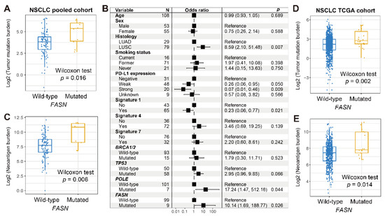 An enhanced TMB was detected in the FASN mutant group (p = 0.016; Figure 5A). Three mutational signatures were determined against NSCLC mutation data (Table S6). A multivariable logistic analysis with clinicopathologic factors, mutational signatures, and DNA repair regulator mutations was incorporated; the link between FASN alterations and elevated TMB was still noticed (p = 0.026; Figure 5B). FASN mutations were also connected with an increased NB (p = 0.006; Figure 5C). Similarly, based on mutation data from the TCGA NSCLC cohort, the significantly enhanced TMB and NB were also found in the FASN mutant subgroup (p = 0.002 and 0.014; Figure 5D,E).