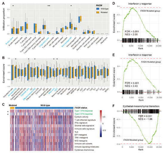 A heatmap was subsequently achieved to illustrate the different enrichment scores of immune-relevant signatures in FASN two subgroups (Figure 6C). Results showed that both types I and II interferon responses were significantly enriched in the FASN mutated group (both p < 0.05). GSEA further confirmed these findings that interferon γ and α responses (which belong to interferons II and I response) were enriched in the FASN mutant subgroup (both NES > 2, FDR = 0.001; Figure 6D,E and Figure S6). The immunosuppressive signaling pathway of epithelial–mesenchymal transition (EMT) was absent in the FASN mutated subgroup (NES = −1.88, FDR = 0.001; Figure 6F and Figure S6).