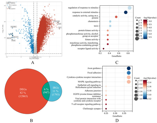 Figure 2. Feature gene selection and overrepresentation analysis outcomes. (A) The volcano plot displays the differentially expressed genes (DEGs) in pancreatic adenocarcinoma (PAAD) according to the TCGA data. The spots represent genes. The top 10 DEGs were labeled. Red shows up-regulated expression in tumorous tissues than normal samples, whereas blue represents the reverse. Non-DEGs are in gray. (B) The Venn diagram demonstrates the intersection of interest. The green region of the Venn diagram shows the number and ratio of DEIRGs. The red and blue sections show DEGs and immune-related genes (IRGs), respectively. (C,D) The bubble plots show gene ontology (GO) and Kyoto encyclopedia of genes and genomes (KEGG) pathway over-representation analyses. The size of the bubble corresponds to the number of genes from our samples found in the GO or KEGG pathway. p-value < 0.05 and FDR < 0.05 are statistically significant.