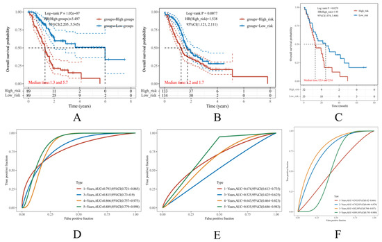 The AUC values in TCGA training set were 0.793, 0.815, 0.866, 0.889 in 1-, 3-, 4-, and 5-year OS (Figure 3D), and those in the ICGC validation set were 0.674, 0.525, 0.643, and 0.835 (Figure 3E). The AUC values in the GEO validation set were 0.543, 0.762, 0.82, and 0.891 in 1-, 2, 3-, and 5-year OS (Figure 3F). In general, an AUC value over 0.7 is considered a good model, and given the fact that the different database has different criteria for patient selection, the potential deviation during the validation was reasonable [38,39]. Comprehensively speaking, the result should be deemed acceptable.