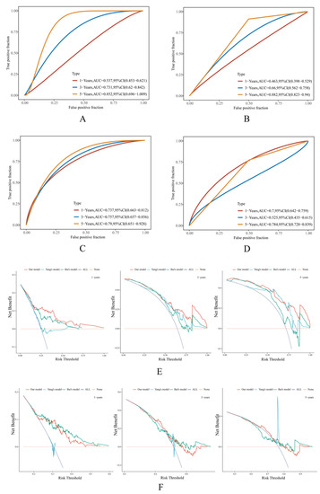 We additionally evaluated the predictive performance through the DCA diagram. Through the diagrams, it was observed that in the TCGA training set, the curve of our model was located superior to the others, suggesting that the corresponding performance was better (Figure 4E). In the ICGC dataset, our model functioned slightly better than the other models in 3- and 5-year OS predictions but was less convincing than Bai’s model in the 1-year OS prediction (Figure 4F).