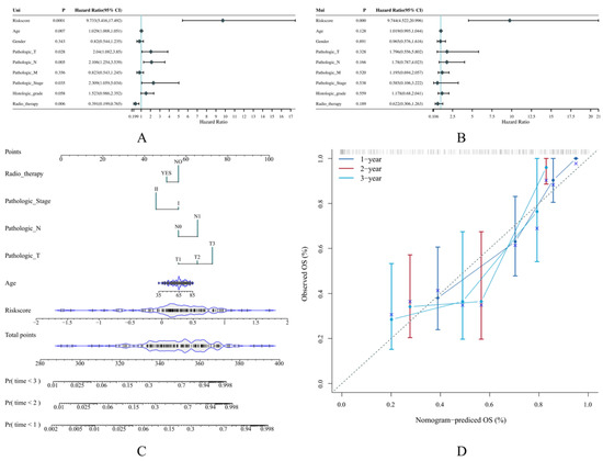 Prognosis is usually linked to diverse clinical factors such as age, gender, pathological stage, and histological grades. Therefore, we conducted univariate Cox regression to examine if the risk score was prognosis-related, and multivariate Cox regression to see if it was an independent prognostic indicator, both along with clinical factors. Subsequently, it was found that the risk score, age, T stage, N stage, pathological stages, and radiotherapy were prognosis-related, but only the risk score could serve as an independent prognosis indicator (Figure 5A,B).