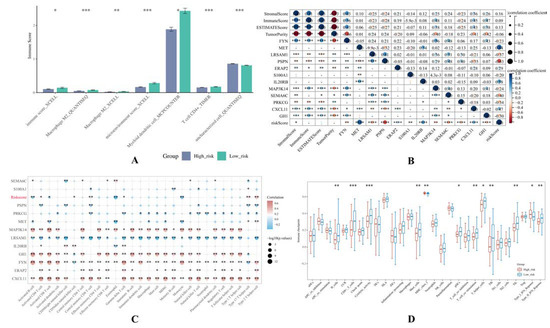 Figure 6. Correlation analysis between the risk score, IRGPI genes, and infiltrating immune cells. (A) The histogram demonstrates the 7 immune-related scores which are statistically different in the high- and low-risk groups. (B) The heatmap demonstrates the correlation between the risk score, IRGPI genes, immune score, stromal score, ESTIMATE score, and Tumor Purity value. The black circles represent the definite value of Spearman coefficients, and the color bar represents positivity or negativity. The deeper color in blue means the more negative the Spearman coefficient is. The deeper color in red means the more positive the Spearman coefficient is. (C) The bubble matrix demonstrates the summary of the correlation between the risk score, IRGPI genes, and 28 infiltrating immune cell types. (D) The box plot demonstrates the differences in immune cell infiltration in high- and low-risk groups.