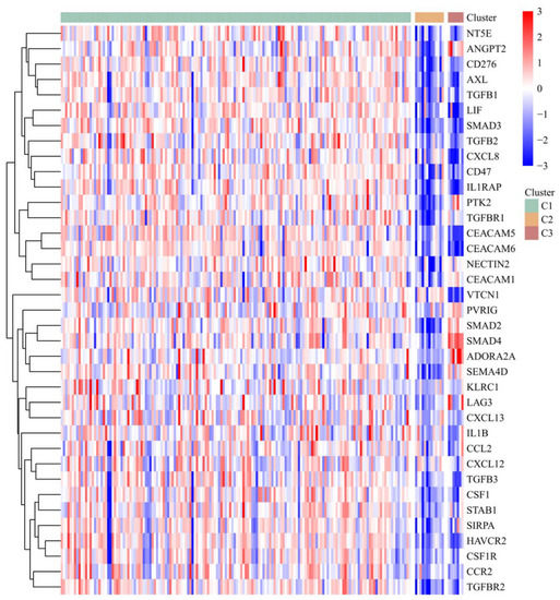 For the analysis of the immune checkpoints, we exhaustively screened all the FDA-approved immune checkpoints up to 2021 including SIGLEC15, TIGIT, CD274, HAVCR2, PDCD1, CTLA4, LAG3, PDCD1LG2, CD276, and VTCN1; the result of which showed that in general, subtype 1 demonstrated a more enriched expression profile of these genes, implicating the potential improvement on its immunotherapy. There was also a prominent difference between subtype 2 and subtype 3, implicating that for patients classified into these molecular subtypes, different extents of immunotherapy should be allocated, and different bio-targets should be targeted (Figure 8). Similar to recent in vitro and in vivo studies reported, the immunotherapy targeting B7 family members, especially B7H3 (i.e., CD276) and B7H4 (i.e., VTCN1), exerted promising efficacy on solid tumors [43,44,45,46,47]. Therefore, although the physical barrier in the PAAD tumor microenvironment remains a major obstacle to overcome, our findings may support further optimization of the current immunotherapy strategies.