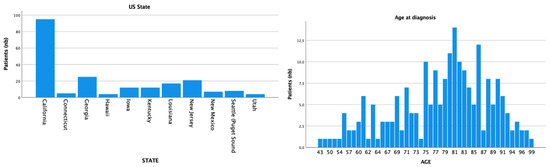 A total of 210 patients with external ear MCC were retrieved. The mean age of our population was 78 (SD = 10.8) and the median age was 80, ranging from 43 to 99 years. Patients were mostly white (n = 191; 91%), of male gender (n = 160; 76.2%), and from California (n = 95; 45.2%) (Figure 1). The majority of patients identified were from US states with a high median household income (n = 129; 63.8%) and high UV exposure (n = 148; 70.5%). For the tumor staging, T1 (n = 64; 68.1%) with N0 (n = 92; 65.2%) and M0 (n = 131; 88.5%) were the most common classifications.