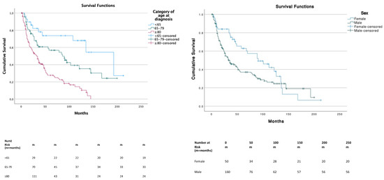 The median OS was 47 months (95% CI, 34.7–59.2) and significantly differed across the three age categories. Patients in the ≥80 years age group had a significantly lower survival compared to other age groups (p < 0.01) with a median OS (mOS) of 32 months (95% CI, 20.6–43.4). Patients in the <65 years age group had a better overall survival compared to ≥80 years (p = 0.000) and 65–79 years (p = 0.041), with a mOS of 193 months (95% CI, 109.1–276.9). Patients in the 65–79 years age group had a mOS of 86 months (95% CI, 51.8–120.2). Survival between sex was significantly (p = 0.038) lower in males (median, 34 months; 95% CI, 21.8–46.1) compared to females (median, 91 months; 95% CI, 48.8–133.2) (Figure 2). Among races, no significative differences were underlined.