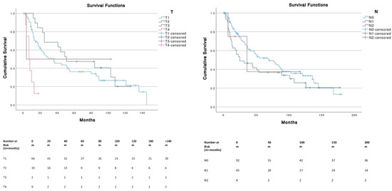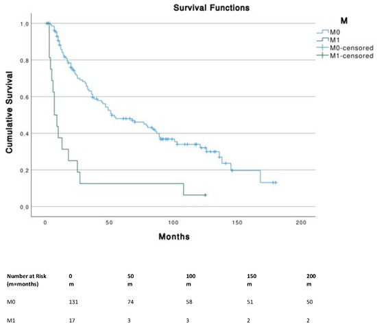Patients with tumor sizes ≤ 5 cm corresponding to T1 (≤2 cm) and T2 (2–5 cm) had a significantly (p < 0.001) higher OS compared to T4 (i.e., primary tumor invades fascia, muscle, cartilage or bone). No significant differences were found across different N stages. The presence of metastasis (M1) was associated with a significantly (p < 0.001) lower survival (median, 7 months; 95% CI, 3.1–10.9) compared to M0 (median, 52 months; 95% CI, 26.3–77.7) (Figure 3).