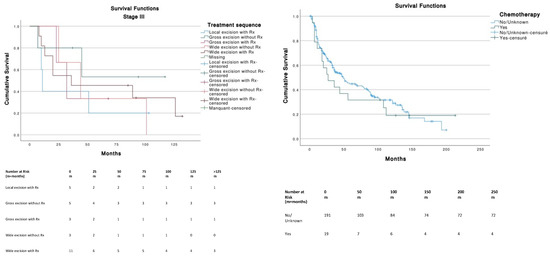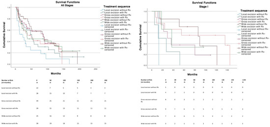 For Stage I tumors (T1N0M0), wide excision without radiotherapy (Rx) was the best therapeutic strategy among other treatments and was significantly better than local excision with (p = 0.013) or without Rx (p = 0.008). Gross excision with Rx was significantly better (p = 0.047) compared to local excision with Rx (Figure 4). For Stage III tumors (T0-T4, N1-3, M0), no significant differences in survival were found across treatments. Stages II (n = 11) and IV (n = 13) were not analyzed because of insufficient data. The use of chemotherapy (median, 27 months; 95% CI, 4.2–49.7) or the absence of chemotherapy (median, 49 months; 95% CI, 34.2–63.7) was not significantly (p = 0.586) associated with a better survival.