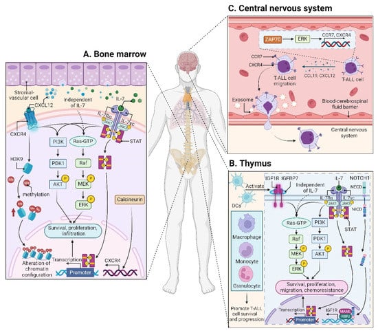 Microenvironments in T-ALL. (A) The interaction between CXCL12 and CXCR4 within the BM niche leads to activation of many signaling cascades, including PI3K-AKT and MEK-ERK pathways in T-ALL cells. CXCR12 also plays an epigenetic role by promoting H3K9 methylation in T-ALL cells. IL7 is produced by stromal cells in the BM (A) and thymus (B), facilitating the activation of JAK-STAT, PI3K-AKT, and MEK-ERK pathways in either an IL7-dependent or IL7-independent manner. (B) In the thymus, the high levels of IGF1R are supported by the activated NOTCH1 signaling. DCs support T-ALL growth via activating IGF1R and its downstream MAPK signaling; other myeloid cells including macrophages, monocytes, and granulocytes also support T-ALL survival and progression. In addition to IGF1R, IGFBP7, which binds to IGF1R, contributes to T-ALL by prolonging IGF1R activation. (C) The CCL19/CCR7 signaling is necessary and sufficient for CNS infiltration in T-ALL. Additionally, ZAP70-ERK-induced upregulation of CCR7 and CXCR4, as well as the exosomes isolated from T-ALL cells also confer an increased risk for CNS involvement. BM, bone marrow; CCL19, CC chemokine ligand 19; CCR7, CC chemokine receptor 7; CNS, central nervous system; CXCL12, CXC chemokine ligand 12; CXCR4, CXC chemokine receptor 4; DCs, dendritic cells; ERK, extracellular regulated protein kinase; H3K9, histone 3 lysine 9; IGF1R, insulin-like growth factor 1 receptor; IGFBP7, insulin-like growth factor binding protein 7; IL7, interleukin 7; JAK, Janus kinase; MAPK, mitogen-activated protein kinase; MEK, MAPK kinase; STAT, signal transducer and activator of transcription; ZAP70, zeta-chain-associated protein kinase 70.