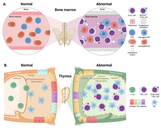 Modification of the BM microenvironment by leukemia cells was well-characterized in B-ALL and AML [126,127,128], whereas the research on the alterations of the BM microenvironment by T-ALL cells is very limited. In 2016, an elegant work reported that an accumulated T-ALL burden within the BM leads to rapid and selective remodeling of the endosteal space, resulting in a complete loss of mature osteoblasts and impairment of normal HSCs [56]. The same conclusion was reached by another group, who additionally found that T-ALL cells suppress osteoblasts and hematopoiesis via activation of the NOTCH1 signaling, since the NOTCH1 blockade attenuates suppression of osteoblasts and HSCs [57]. Very recently, scientists discovered that T-ALL-produced extracellular vesicles can also disturb the quiescence and maintenance of HSCs and HPCs in the murine BM environment, thereby inducing exhaustion of the healthy HSCs and HPCs to compromise the hematopoietic system balance [58] (Figure 3A). Although these works have revealed certain effects of T-ALL cells on BM remodeling and dysfunction, it remains unclear whether additional mechanisms contribute to T-ALL-induced BM environmental alterations, a critical topic requiring further investigation.