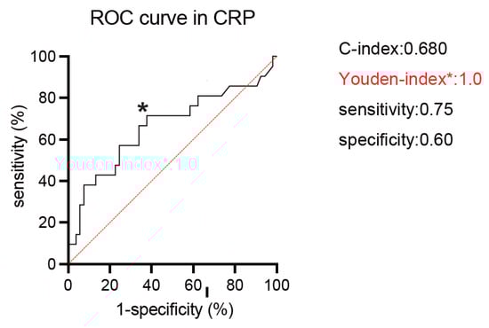 Receiver operating characteristic (ROC) curves of serum C-reactive protein (CRP: mg/dL) to predict lethality. The Youden index (* in the curve) identified a CRP of 1.0 mg/dL as an optimal cut-off value.