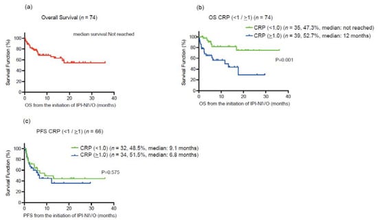 (a) Kaplan–Meier curve for overall survival (OS) in all 74 metastatic renal cell carcinoma (mRCC) patients treated with ipilimumab plus nivolumab. (b) Kaplan–Meier curves for overall survival (OS) according to the cut-off of serum C-reactive protein (CRP) 1.0 mg/dL. (c) Kaplan–Meier curves for progression-free survival overall survival (PFS) according to the cut-off of serum C-reactive protein (CRP) 1.0 mg/dL.