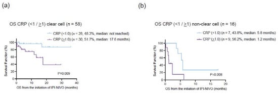 (a) Kaplan–Meier curves for overall survival (OS) in 58 clear cell renal cell carcinoma (ccRCC) according to the cut-off of serum C-reactive protein (CRP) 1.0 mg/dL. (b) Kaplan–Meier curves for overall survival (OS) in 16 non-clear cell RCC (nccRCC) according to the cut-off of serum C-reactive protein (CRP) 1.0 mg/dL.