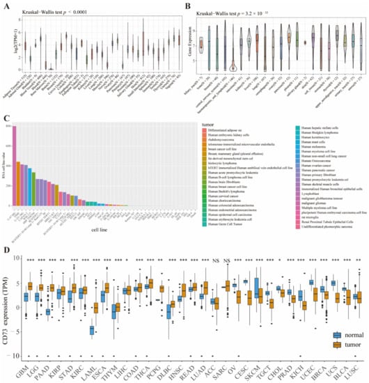 CD73 is widely expressed in cancer cell lines, normal and tumor tissues. CD73 expression in human normal tissues (A). CD73 expression in cancer cell lines from CCLE (B) and HPA (C) databases. CD73 expression in normal and tumor tissues from TCGA and GETx (D) databases. * p< 0.05, ** p < 0.01, *** p < 0.001, NS: no significant differences.