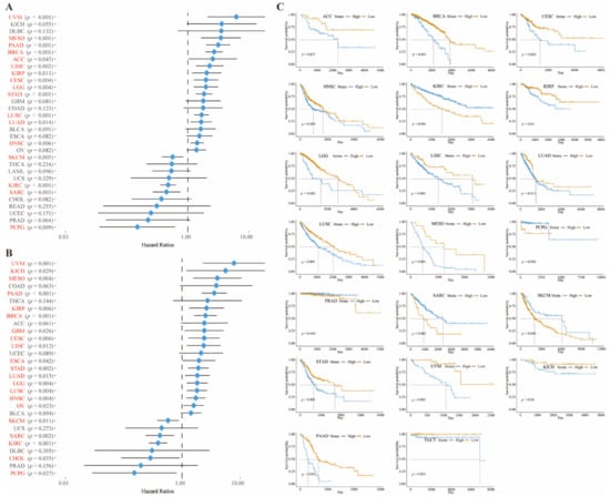Then, we demonstrated the mutation of CD73 in these cancers from the cBioportal website (Figure S1). The level of mutations in DLBC and PRAD was high, and the frequency of deep deletions in CD73 exceeded 4% (Figure S1A). We also measured CD93 mRNA expression, mutation type, structural variant, and copy number in these tumors (Figure S1B). Seventy-four mutation sites (including 64 missenses, 8 truncating, 1 fusion, and 1 inflame) were detected between 0 and 574 amino acids (Figure S1C). Clinical and RNA sequencing data were outputted from public websites to further identify the prognostic role of CD73. Our data indicated that CD73 can accurately predict good or bad OS (Figure 2A) and DSS (Figure 2B) in many tumors. Overexpressed CD73 was related to decreased OS in ACC, BRCA, CESC, HNSC, KIRP, LGG, LIHC, LUAD, LUSC, MESO, STAD, UVM, KICH, PAAD, and TGCT. However, in KIRC, PCPG, PRAD, SARC, and SKCM, upregulated CD73 was related to prolonged OS Figure 2C; (p < 0.05). Elevated CD73 was associated with decreased DSS in BRCA, CESC, COAD, ESCA, GBM, HNSC, KIRP, KICH, LGG, LIHC, LUAD, LUSC, MESO, PAAD, STAD, TGCT, OV, and UVM, and with prolonged DSS in CHOL, KIRC, PCPG, SKCM and SARC (Figure S2; p < 0.05).