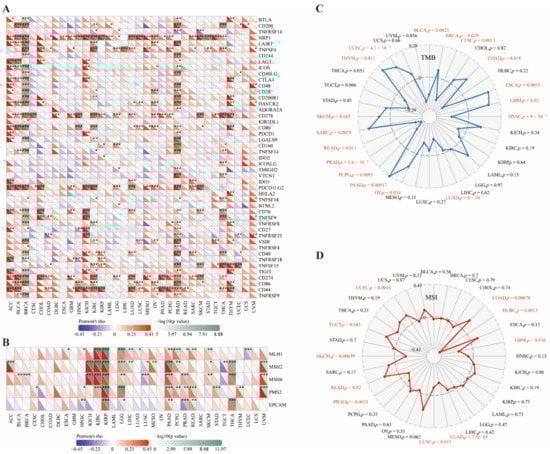 To further elaborate on the potential value of CD73 in immunotherapy, we compared the relationship between CD73 and classical immune checkpoints in various cancers (Figure 3A). The immune checkpoints most linked to CD73 were NRP1, CD276, PDCD1LG2 (PD-L2), CD274 (PD-L1), and CD44. We also analyzed the correlation between CD73 and five DNA mismatch repair (MMR) markers, including MLH1, MSH2, MSH6, PMS2, and EPCAM, in these cancers (Figure 3B). CD73 expression was significantly linked to all MMR markers in KIRP, LGG, PAAD, and PRAD (p < 0.05). In addition, CD73 levels were positively related to tumor mutation burden (TMB) in BRCA, COAD, ESCA, GBM, OV, PAAD, SARC, SKCM, THYM, and UCEC, and negatively linked to TMB in BLCA, CESC, HNSC, LUAD, PCPG, PRAD and READ (Figure 3C; p < 0.05). Moreover, CD73 levels were positively linked to microsatellite instability (MSI) of COAD, READ, TGCT, and UCEC, while negatively linked to MSI of DLBC, GBM, LUAD, LUSC, PRAD, and SKCM (Figure 3D; p < 0.05).