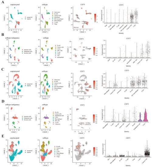 Data integration of BRCA (GSE75688 and GSE118389) [34,35] was performed using the R package Seurat (anchoring function). Single-cell sequencing datasets for STAD were taken from the GEO database (GSE183904) [36]. Quality control of mitochondrial and ERCC genes was performed using the R package Seurat [37]. Principal component analysis (PCA) and cell clustering were performed as previously [33]. R packages (infercnv and copycat) were conducted to identify tumor cells. The annotation of non-tumor cells (immune and stromal cells) was based on specific markers. The specific markers of non-tumor cells are listed as follows: fibroblast (COL3A1), M2 macrophage (CD163,CD68,MRC1), B cell (CD79A), plasma cell (JCHAIN), T cell (CD3D, CD8A, CD4), NKs (GNLY, NKG7, EOMES, KIR2DL3, GZMA), astrocyte (ALDH1L1, SLC1A3, SLC1A2, GFAP), immune cell (PTPRC), Tregs (FOXP3, IL2RA), DC (CD80, CD86, CD40), FDCs (CR2, FCER2, CR1), plasma cell (SDC1, TNFRSF17), neutrophils (CEACAM8), ILC1 (TBX21, IKZF3, CXCR3), ILC2 (GATA3, MAF, PTGDR2, HPGDS), ILC3 (RORC, IL23R, IL1R1, KIT). Dimensionality reduction for visualization was performed using the UMAP function. Vlnplot, Dimplot, and Featureplot were used to visualize CD73 expression. When collecting samples for RNA bulk sequencing or single-cell sequencing analysis, tumor samples are usually surrounded by some paraneoplastic tissues consisting of infiltrated cells. Thus, immune and stromal cells can be counted as a reflection of the tumor microenvironment during the data analysis. The R package “Monocle” was used to perform ingle-cell pseudo-time trajectory analysis. Cells in the same segment of the trajectory are considered to have the same “state”. The cell–cell interaction was analyzed by the R package “CellChat” [38].