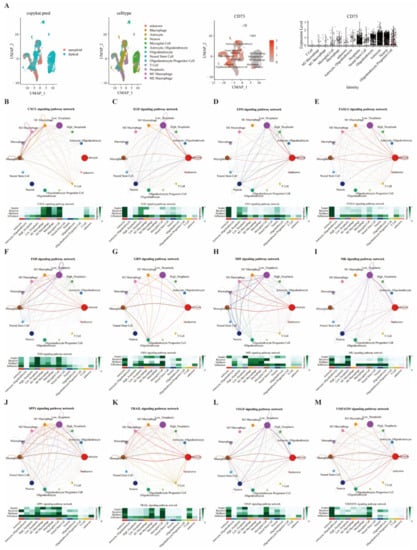Moreover, various cell types in GBM expressed elevated CD73, including oligodendrocyte progenitor cells, neurons, astrocytes, neoplastic, oligodendrocyte, neural stem cells, microglial cells, macrophages, M1 and M2 macrophages (Figure 6A). The cellular communication of CD73 expression and infiltrated cells was analyzed through the R package “CellChat”. These identified 14 cell types are grouped into four types based on their different roles in cellular communication: sender, receiver, mediator, and influencer. The cell patterns regarding the 14 cell types (receivers and senders) were classified into three different models ( Figure S9A,C). The specific genes associated with these receiver and sender communication patterns show three patterns (Figure S9B,D). The dot plots (Figure S10A,B) and river plots (Figure S10C,D) depicted the communication patterns of the receiver and sender for 14 cell types. Astrocytes, neoplastic cells (high and low), and neural stem cells were correlated with the signaling pathways of receiver and sender in pattern 1. We further described the correlation between CD73 levels and corresponding signaling pathways. Neoplastic cells expressing CD73 exhibited strong interaction with macrophages through the CXCL, EGF, EPO, FASLG, FSH, GRN, MIF, MK, SPP1, TRAIL, VEGF, and VISFATIN signaling pathways (Figure 6B–M). Neoplastic cells expressing CD73 exhibited strong interaction with T cells through the CXCL, EGF, FASLG, MIF, MK, SPP1, TRAIL, and VISFATIN signaling pathways (Figure 6B–M).