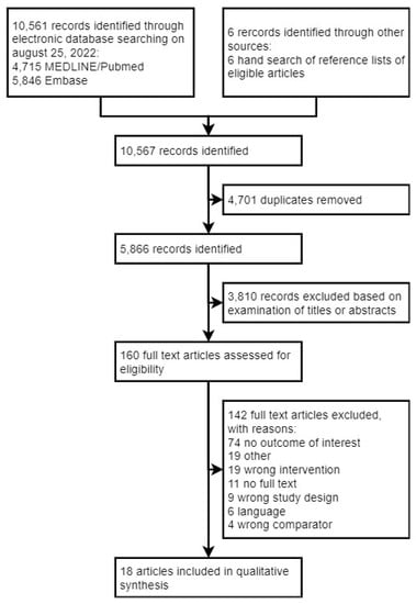 Our initial electronic database search identified 10,561 records (Figure 1). After removing duplicates and screening all titles and abstracts, 142 trials were scrutinized for further eligibility. Of those, eighteen articles met our eligibility criteria and were consequently included in our qualitative analysis. Most records were excluded because they did not report lower limb or genital LE as a separate outcome.