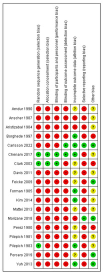Figure 2 and Figure 3 outline the Risk of Bias (RoB) assessment of all the included studies. Overall, the RoB within included studies was considered very high. Since only three RCTs were included, there was a high risk of selection, detection and performance bias. Most studies had a low or moderate RoB regarding attrition bias. Reporting bias was rated as high, with only one study that predefined lymphedema in its methods [13]. Other sources of bias were often unclear.