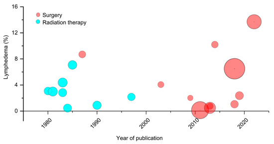 Bubble plots, depicting the prevalence of lower limb lymphedema for surgery (blue) and radiation therapy (orange) over time. Bubble area corresponds to the sample size.