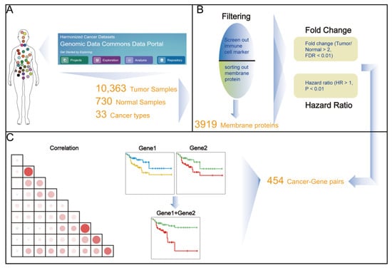 Gene expression of 17 types of tumor samples were collected from TCGA on the University of California Santa Cruz (UCSC) Xena website (https://xenabrowser.net/ (accessed on 1 September 2020)) in fragments per kilobase million (FPKM) (See Table 1 for detailed sample numbers). Human membrane protein information was obtained from the databases: Membranome (https://membranome.org/ (accessed on 1 September 2020)) [27,28] and Uniprot (https://www.uniprot.org/ (accessed on 1 September 2020)) [29]. Human immune cell biomarkers were obtained from the database: CellMarker, and the membrane proteins on the immune cells were excluded [30]. The RNA expression data of 54 human normal tissues were obtained from the GTEx (Genotype–Tissue Expression) project data set (V8 release) [31].