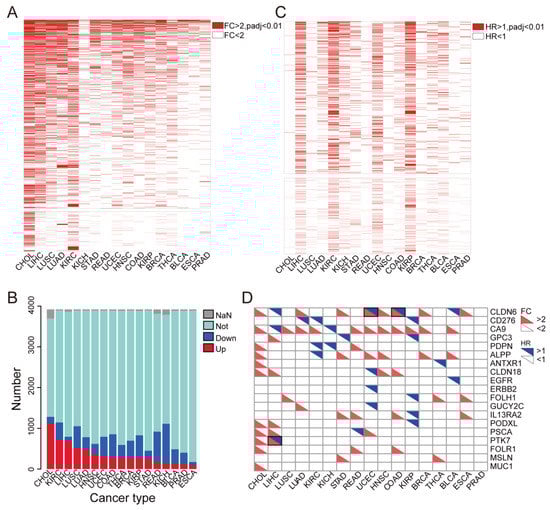 Tumor-specific high-expression and high-risk surface proteins in TCGA tumor tissues. (A) Heatmap plot displays the differential expression analysis of the tumor tissue-specific highly expressed membrane proteins. A FC > 2, and the adjusted p value less than 0.01 is considered statistically significant. (B) Membrane proteins displayed poor prognosis in cancer patients. A HR > 1, and the adjusted p value less than 0.01 was considered statistically significant. (C) Stacked bar blot showed the categories of 3919 membrane proteins: up-regulation (up), down-regulation (down), no change significance (not), and missing data (NaN). (D) The color block diagram shows the FC and HR of the target proteins, all colored squares are statistically significant.