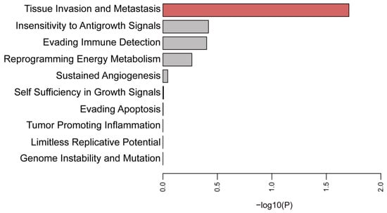 Enrichment analysis of significant high-expression and high-risk genes using the ten cancer hallmarks. The horizontal axis represents the logarithm of the p value, and the vertical axis represents the terms of the ten cancer hallmarks. p values less than 0.05 were considered statistically significant, indicated by the red color bar.