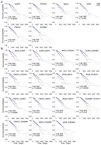 To further investigate the combinatorial effects of these genes on the survival of the cancer patients, we established a risk scoring system using a formula containing the gene expression levels and the regression coefficients from the univariate Cox regression model (Table S2). We found that the combined analysis of these genes displayed greater accuracy in predicting the prognostic outcomes of the cancer patients (Table S1 and Figure 4A,B). For example, the prognostic risk stratification power was improved by the following combination of groups, such as SEZ6 and ULBP1, ULBP2 and MAFA, and PCDHD1 and MAFA, compared with the results when the genes were individually analyzed.