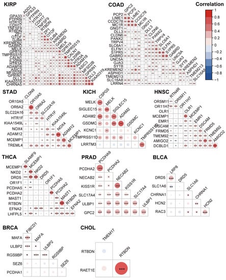 Correlation analysis of the membrane protein-coding genes in different tumor types. The bubble plot shows the Pearson correlation between the high-expression and high-risk membrane protein-coding genes for various cancers from Table 2. The red bubbles represent positive correlations. The blue bubbles represent negative correlations. * means p < 0.05, ** means p < 0.01, and *** means p < 0.001.