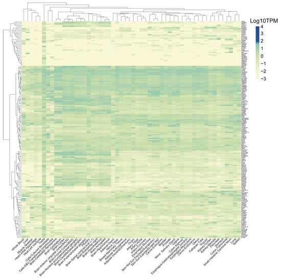 Heatmap displays the expression levels of the low-expression genes in the 54 normal tissues from the GTEx database.
