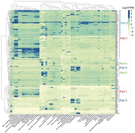 To further investigate the potential “on-target, off-tumor toxicity” effect of these proteins, we obtained the expression levels of the 371 target membrane protein-coding genes (See Table 2 for details) from 54 normal human tissues from the GTEx database. The cumulative distribution analysis demonstrated that the TPM expression levels of most genes were logarithmically distributed between −2 and 1.60 (Figure S3). We defined the genes with expression levels greater than or equal to 1.60 as high-expression genes, while genes with expression levels less than 1.60 as low-expression genes. According to this threshold, the genes were divided into two categories (Figure S3). Our results indicated that 184 genes were expressed less in these tissues (Figure 6) and the other 187 genes, which were specifically and highly expressed in some normal tissues (Figure 7). The genes in part one were relatively highly expressed in all brain tissues, while the genes in part two were widely expressed in all tissues. The genes in part three were mainly expressed in the human epidermis, mucous membranes, and glands. The genes in part four were highly expressed in blood cells, lymphocytes, and the spleen (Figure 7).