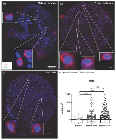 - Piras, F.; Colombari, R.; Minerba, L.; Murtas, D.; Floris, C.; Maxia, C.; Corbu, A.; Perra, M.T.; Sirigu, P. The predictive value of CD8, CD4, CD68, and human leukocyte antigen-D-related cells in the prognosis of cutaneous malignant melanoma with vertical growth phase. Cancer 2005, 104, 1246–1254. [Google Scholar] [CrossRef] [PubMed]
