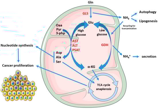 Since the early discovery that HeLa cells consume Gln from 10 to 100 orders of magnitude more than other amino acids [11], and that Gln is used as a major source of cell energy, rather than for incorporation into proteins [12], the observation that transformed cells display a high rate of Gln consumption has been confirmed in several other cancer cell types, such as glioblastoma, ovarian, pancreatic, and breast cancer [13,14,15,16]. Through mitochondrial glutaminolysis, Gln is utilized to provide both carbon and nitrogen for anabolic reactions; in particular, through the process of anaplerosis, which leads to the replenishment of the pools of metabolic intermediates of the tricarboxylic acid cycle (TCA) in times of high energy requirements [17], Gln is a major carbon source for the synthesis of proteins, nucleotides, and lipids. In this pathway, Gln is first converted into glutamate (Glu) via mitochondrial glutaminase (GLS), and then glutamate dehydrogenase (GDH) convert glutamate into α-ketoglutarate (α-KG); alternatively, a second pathway of conversion of Glu in α-KG involves the activity of both mitochondrial and cytosolic transaminases such as aspartate transaminase (AST), alanine transaminase (ALT), or phosphoserine transaminase (PSAT). The routing of glutamate to the dehydrogenation or to the transamination pathway depend on the metabolic status of the cell and has important metabolic consequences; although the prevalence of transamination over dehydrogenation has been positively correlated with proliferation rate [18] and glucose levels, both pathways enable the optimization of amino acid uptake and consumption with growth and biomass production, with transamination being prevalent in times of glucose abundance, while the glutamate dehydrogenation pathway has been shown to be induced during glucose shortages, thus enabling cell survival [19,20]. Furthermore, sequential glutaminase and glutamate dehydrogenase reactions produce ammonia (NH3) and ammonium (NH4+), respectively, which is considered a cell toxic by-product which requires scavenging through urea; however, ammonia is also a major diffusible autophagy inducer [21], which could therefore help cancer cells increase fitness by eliminating damaged and potentially toxic macromolecules and organelles. Moreover, in breast cancer, extracellular ammonia synthesized in the liver can be recycled by tumor cells through reductive amination by GDH to form glutamate which is then used for macromolecule biosynthesis [22], and Gln-derived ammonia can also promote sterol regulatory element binding protein (SREBP) mediated lipogenesis and support tumor growth [23]. A graphical representation of the above-described metabolic scenario is provided in Figure 1. Glutamate transamination, on the contrary, does not produce ammonia, but generates the NEAAs aspartate (Asp), alanine (Ala), and serine (Ser) which, together with α-KG, serve as anaplerotic substrates in the TCA cycle, thus promoting biosynthesis. In this process, Oxaloacetate (Oaa) produced by α-KG from glutaminolysis condenses with pyruvate-derived Acetyl-CoA to produce citrate at the citrate synthase step; citrate is then not committed to the isocitrate dehydrogenase step (which is instead involved in reductive carboxylation—see below), but is instead exported to cytosol where ATP-citrate lyase reforms Acetyl-CoA, which is then used for malonyl-Coa synthesis and de novo lipogenesis. Glutaminolysis flux also generates reduced nicotinamide adenine dinucleotide (NADH) and reduced nicotinamide adenine dinucleotide phosphate (NADPH), as reducing equivalents for the electron transport chain (ETC) and both redox balance and lipogenesis, respectively. Beyond glutaminolysis, which is considered as the oxidative branch of Gln metabolism, the alternate metabolic fate of Gln is through the reductive carboxylation pathway, which involves the engaging of α-KG in a “reverse” mitochondrial TCA cycle through NADPH-dependent isocitrate dehydrogenases 1 and 2 (IDH1 and IDH2) and therefore producing citrate for lipid biosynthesis [24,25,26]. This pathway seems to be predominant in cancer subjected to hypoxia, displaying constitutive hypoxia-inducible factor 1 alpha (HIF1α) activation, or have defective mitochondria [27,28] and has been confirmed to occur also in vivo [28,29].