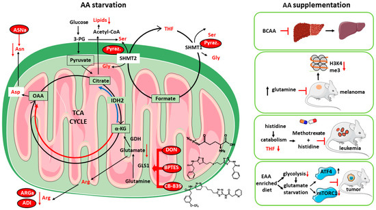 Both amino acid starvation (left) and supplementation (right) are valuable anti-cancer strategies. (Left) panel: mitochondrial glutamine consumption in cancer feeds TCA cycle in both oxidative (red) and reductive (blue) directions which, by providing carbon source for the synthesis of precursors, increases cancer biomass. Interfering with glutaminase (GLS1) activity with the inhibitors DON, BPTES, or CB-839 leads to the depletion of key anabolic intermediates such as lipids and aminoacids. Anti-cancer enzymatic approaches through asparaginase (ASNase), arginase (ARGase), or arginine deaminase (ADI) also lead to the decrease in blood levels of indispensable tumor AAs. Furthermore, interfering with serine or glycine metabolism with the dual SHMT1/SHMT2 inhibitor pyralozopyran also results in depletion of tetrahydrofolate (THF), a key metabolite essential for cancer growth. (Right) panel: BCAA supplementation is beneficial in cirrhotic patients, while diet with high gln content blocks melanoma xenografts in mice by reprogramming the tumor epigenetic control of gene expression. Histidine supplementation, by increasing His catabolism and depleting THF, increases methotrexate sensitivity in leukemia-bearing mice, while an EAA-enriched diet impairs tumor growth in mice by inhibiting glycolysis and mTORC1 signaling by means of an EAA-induced ATF4 activation through shortage of glutamate. Abbreviations: 3-PG, 3-phosphoglycerate; IDH2, isocitrate dehydrogenase 2; SHMT1/SHMT2, serine hydroxymethyltransferase ½; GDH, glutamate dehydrogenase; α-KG, alpha-ketoglutarate; ATF4, activating transcription factor 4; mTORC1, mammalian target of rapamycin complex1; H3K4me3, lysine-methylated histone 3; pyraz, pyrazolopyran. The icons used were obtained at: https://smart.servier.com/ (accessed on 10 November 2022).