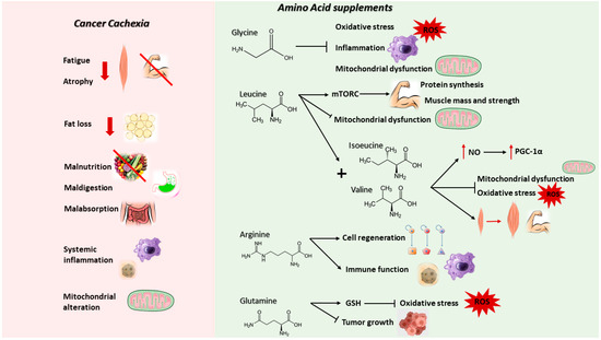Recent data showed that supplementation with an enriched mixture of branched-chain AAs (BCAAem), a subset of EAAs that comprises Leu, Ile, and Val, integral components of skeletal muscle proteins and powerful stimulators of protein synthesis, increases nitric oxide (NO) production via endothelial NO synthase (eNOS), inducing the expression of PGC-1α, a transcription coactivator and main regulator of mitochondrial biogenesis (reduced in cancer cachexia) and of genes involved in the ROS defense system including superoxide dismutase 1 (SOD1), superoxide dismutase 2 (SOD2), catalase and glutathione peroxidase (GPx1), decreasing oxidative damage and promoting survival [89,105,114]. As a result of PGC-1α increased expression, both glycogen accumulation and fatty acid oxidation improve, preserving mitochondrial metabolism and muscle fiber size, and ameliorating physical endurance and motor coordination in middle-aged mice, suggesting a potential role in the treatment of sarcopenia and cancer cachexia [105,114]. Recent evidence demonstrated that BCAAem was able to preserve skeletal muscle, mitigating muscular dystrophy in an experimental model of Duchenne Muscular Dystrophy (mdx mice), and clinical trials confirmed an improvement of physical performance, muscle mass, and strength in sarcopenic patients [105]. Another relevant study proposed supplementation with BCAA, Tyr, and Cys in order to improve lean muscle mass in cachectic patients with advanced cancer [89,91,101]. Despite some limitations, for example the numerosity, the lack of a control group, and the heterogeneity of patients according to cancer type, ROS reduction and improvements in strength and quality of life were observed [89,91].