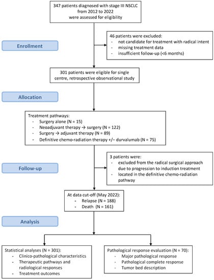 This is a single-center observational retrospective (before 2018) and prospective (since 2018) study including a consecutive series of stage III NSCLC patients who were referred to the thoracic oncology multidisciplinary team of the Veneto Institute of Oncology and University Hospital of Padua (Italy) between November 2012 and November 2021, and who where considered eligible for a radical treatment. This study did not involve any change in the diagnostic and therapeutic management of patients under observation. The study design is represented in Scheme 2.
