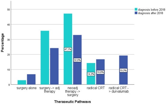 Bar graphs of therapeutic pathways before and after 2018. CRT, chemo-radiation therapy.