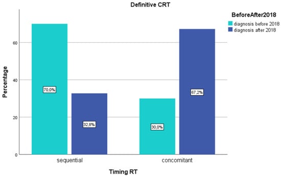 Bar graphs of timing of radiotherapy before and after 2018. CRT, chemo-radiation therapy; RT, radiotherapy.