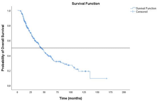 The overall population was evaluated for the primary aim of the study. Statistical analysis was performed using IBM Statistical Package for the Social Sciences (SPSS) software Version 26 (Inc., Chicago, IL, USA). Continuous variables were summarised by descriptive statistics, including means, standard deviations, medians, and ranges. Categorical variables were tabulated by frequency and percentage. Kaplan–Meier survival curves were calculated and p-values derived using a log-rank test were used to determine statistical significance of any effect observed. The Cox proportional hazards model was used to assess the impact of covariates on OS and RFS. Univariate and multivariate Cox models were analysed. The statistical significance level was set at p < 0.05 for all tests. OS was calculated from the date of histological diagnosis until death, patients alive at the time of analysis were censored at the date of last recorded follow-up. RFS was calculated from the date of radical surgery or beginning of CT-RT with radical intent to the date of first recurrence. Patients without recorded clinical or radiological progression were censored at the date of death (if deceased at time of analysis) or date of last recorded follow-up.