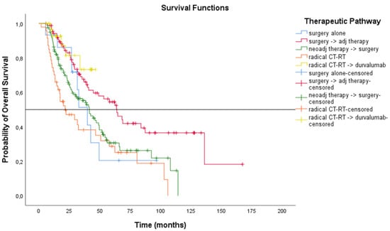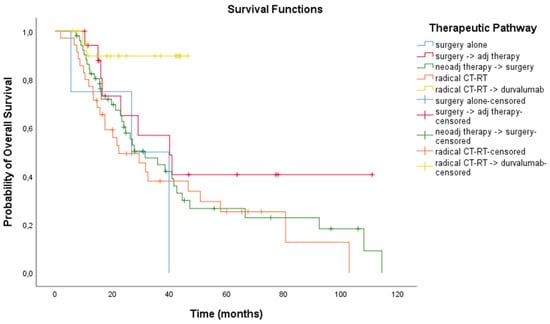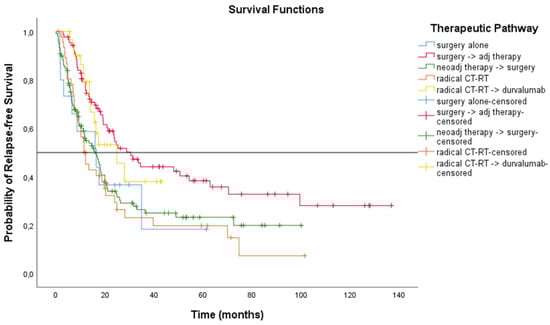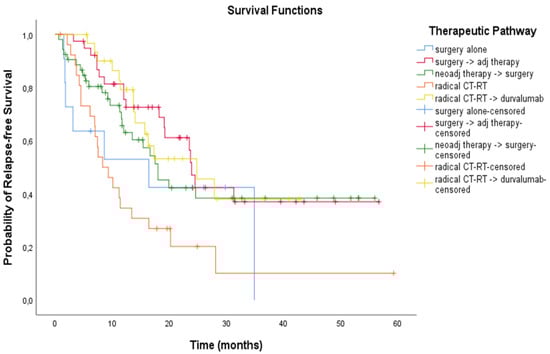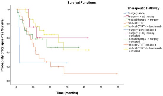 We analysed the outcomes as per radical treatment modality: both the mRFS and the mOS were significantly different among subgroups (p = 0.002 for RFS analysis and p < 0.001 for OS analysis) according to the therapeutic pathway. Patients receiving surgery followed by adjuvant treatment and CT-RT followed by durvalumab had better outcomes (see Figure 6 and Figure 7). Outcomes as per treatment modality are described in Table 4.