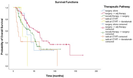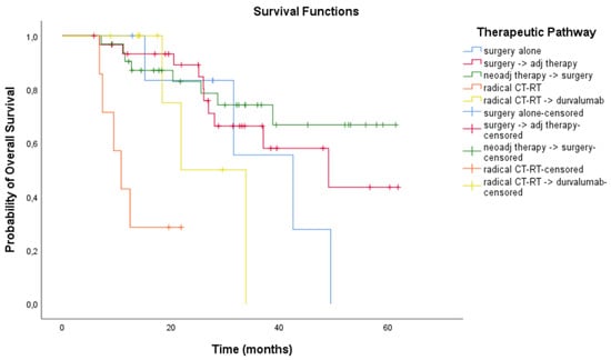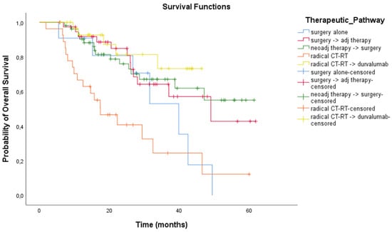 Patients received systemic therapy and radiation therapy at the Veneto Institute of Oncology—IRCCS in Padova, while surgery, whenever indicated, was performed at the Thoracic Surgery Unit of the University Hospital of Padova. A multidisciplinary team, including at least a medical oncologist, a radiation oncologist, a pulmonologist and a thoracic surgeon evaluated all the patients and decided the treatment plan according to clinical practice of the reference period: radical surgery followed by adjuvant CT and/or RT; neoadjuvant CT and/or RT treatment followed by radical surgery; concurrent or sequential definitive CT-RT; patients who had disease control after CT-RT with radical intent either received consolidation durvalumab or did not depending on PD-L1 expression.
