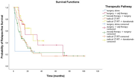 Kaplan–Meier curves of estimated relapse-free survival in the entire population who underwent definitive chemo-radiation therapy according to treatment pathway. CT-RT, chemo-radiation therapy.