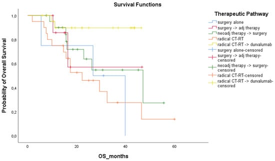 Additionally, selecting stage IIIB-C patients treated after 2018 (n = 75, 24.9%), a statistical significance was found in terms of mRFS (p = 0.047) and mOS (p = 0.024) according to treatment strategies (see Figure 14 and Figure 15). In detail, in terms of mRFS, better outcomes were achieved by surgery followed by adjuvant treatment and CT-RT followed by consolidation durvalumab. In terms of mOS, despite the immaturity of the data, the best outcome was achieved by the CT-RT treatment plus durvalumab arm.