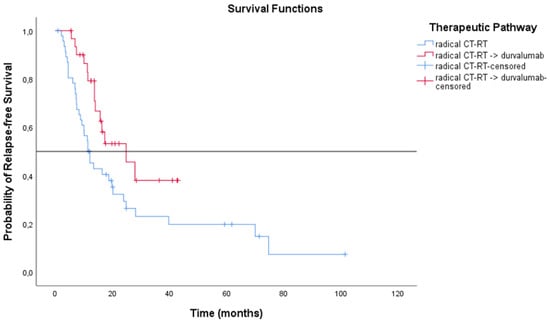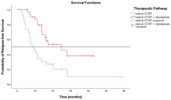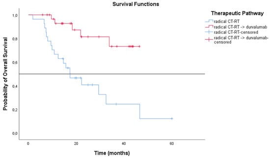 Furthermore, considering patients treated with CT-RT after the introduction of immunotherapy as consolidation therapy (n = 58), a more statistically significant difference was observed in terms of mRFS (p = 0.002) and mOS (p < 0.001) between two subgroups, as shown in Figure 18 and Figure 19.
