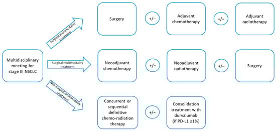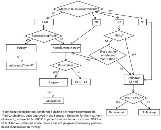 About 30% of new NSCLC cases are diagnosed at a locally advanced stage (i.e., stage III), which includes a highly heterogeneous group of patients with differences in tumour size, local extension, and pattern of nodal involvement [,]. The management of stage III NSCLC involves a multidisciplinary approach and a careful patient selection for surgery or radiation therapy integrated with systemic treatment []. Although the intent of treatments in locally advanced lung disease is potentially curative, survival data in stage III NSCLC still remain disappointing: five-year survival rates are 36%, 26%, and 13% in stages IIIA, IIIB, and IIIC, respectively [,]. Currently, pathological mediastinal lymph node staging is strongly recommended to establish the appropriate therapeutic strategy []. Surgery may be indicated for N1 or single N2 station involvement, possibly after neoadjuvant chemotherapy [,]; the right management of multistation N2 involvement is still a matter of debate. Treatment algorithm of stage III according to guidelines and recommendation is summarised in Scheme 1.