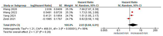 Only 4 studies [34,35,36,38] reported this data. Overall, a diagnosis of lung cancer increased the risk of COVID-19 infection (HR = 2.73 [95%CI 0.84, 8.94], p = 0.1; Figure 2).