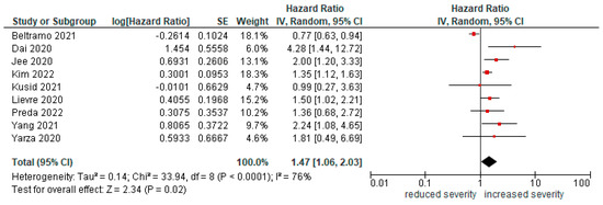 Nine studies [13,17,23,24,25,27,31,36,37] reported the risk of severe infection (life-threatening or requiring ICU admission/mechanical ventilation) in patients with lung cancer compared to non-lung cancer patients. Lung cancer diagnosis increased the risk of severe disease (HR = 1.47 [95%CI1.06, 2.03], p = 0.02; Figure 3). Compared with other cancers, severity is increased (HR = 1.39 [1, 1.93], p = 0.05).